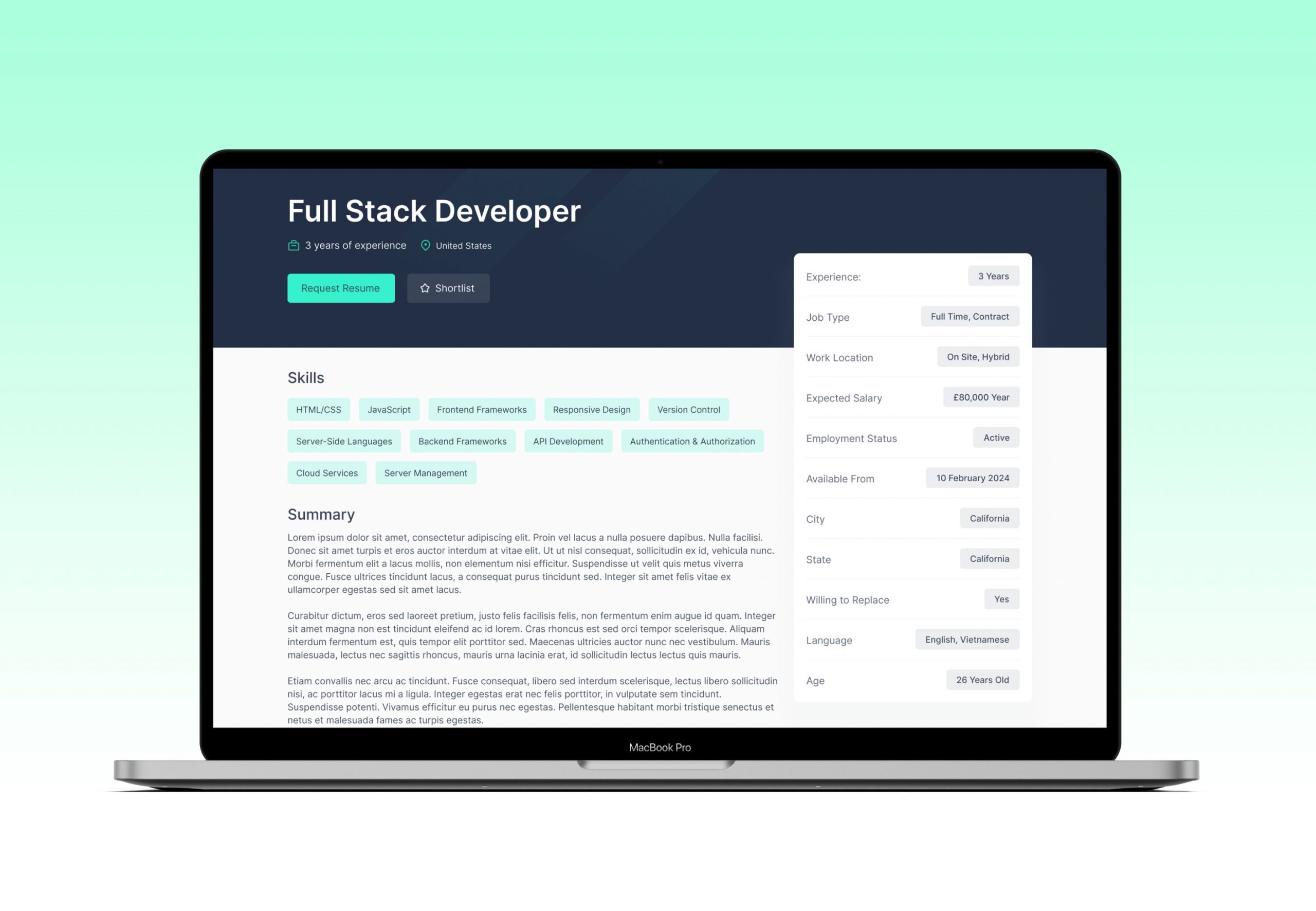 - The solution included integration with RecruitCRM so employers could search candidates directly from the platform. A “Request Resume” action was included in the process, supported by a structured information form capturing requester details such as name, email, and phone. That information would then be submitted to AWS Lambda to trigger follow-up actions and stakeholder emails.